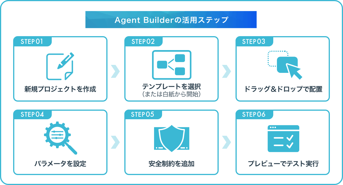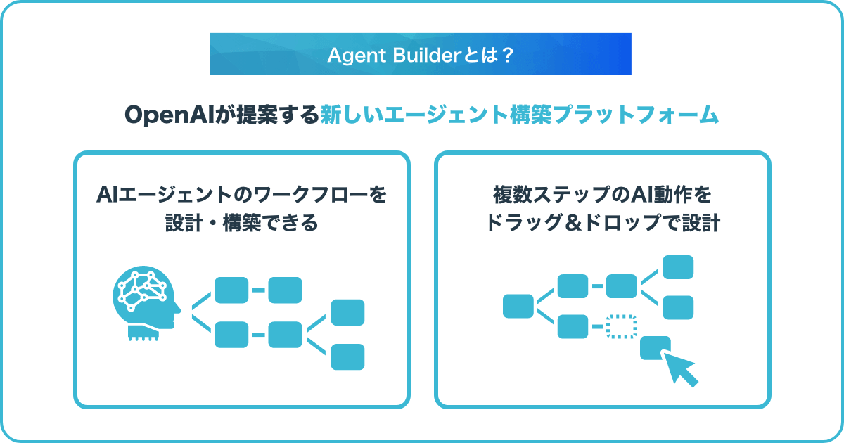 Agent Builderはその中核に位置し、複数ステップのAI動作をドラッグ&ドロップで設計できるのが最大の特徴です。