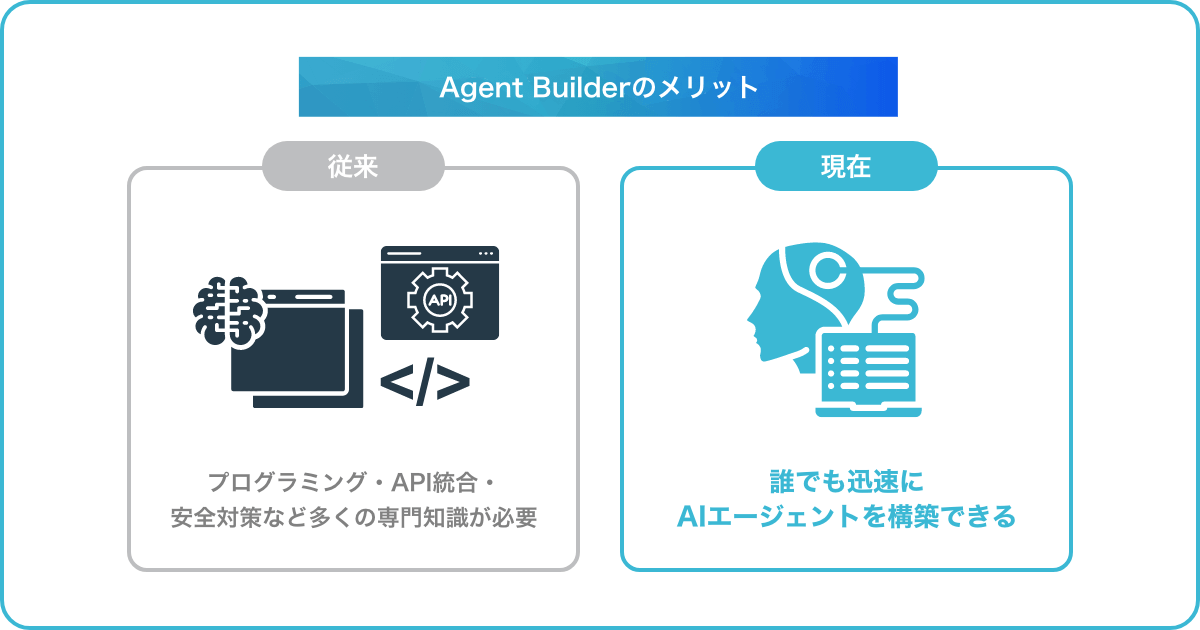 Agent Builderの最大のメリットは、「誰でも迅速にAIエージェントを構築できる」点にあります。従来、エージェント構築にはプログラミング・API統合・安全対策など多くの専門知識が必要でした。