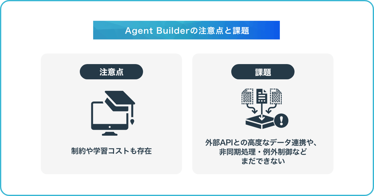 Agent Builderは強力なツールですが、現時点ではβ版のため制約や学習コストも存在します。