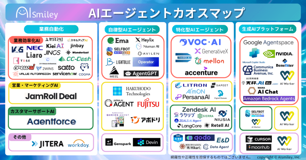 ※このカオスマップは、AIエージェントサービス提供企業のプレスリリースやサービスオフィシャルサイト、実績などの公開情報を基にAIsmiley編集部が独自の視点で取りまとめたもので、網羅性や正確性を完全に担保するものではありません。