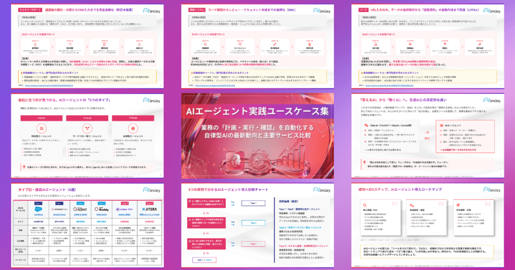 そこでAIsmileyは、単なる概念の紹介にとどまらず、現場での具体的な処理フローから、エージェントの選定、定着、全社展開へと至るロードマップを描くための実践書として、本資料を作成しました。