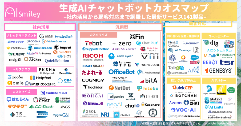 AIポータルメディア「AIsmiley」を運営する株式会社アイスマイリーは、社内活用から顧客対応まで網羅した最新の生成AIチャットボットをまとめた「生成AIチャットボットカオスマップ」を、2025年10月28日(火)に公開しました。掲載総数は141製品です。
