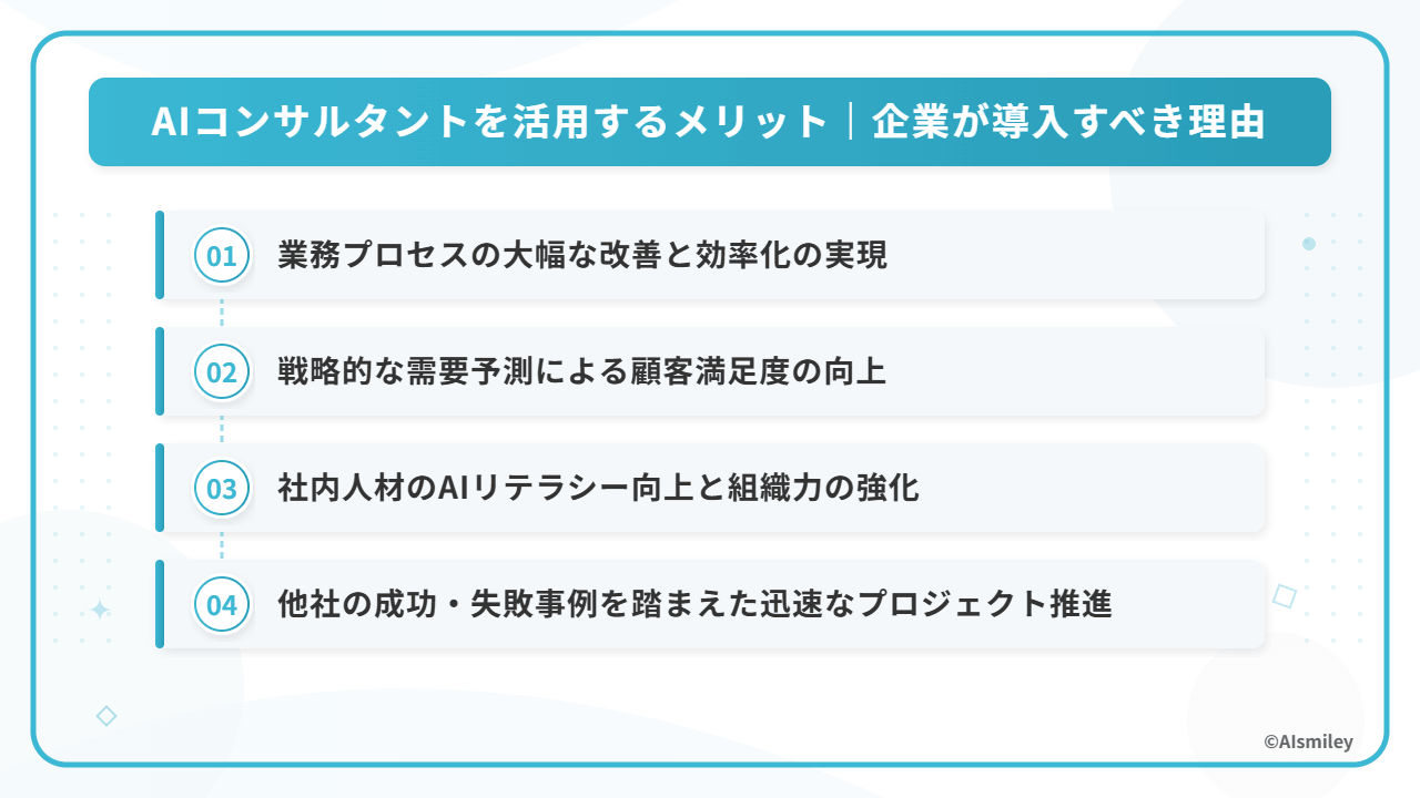 そのため、社員向けの研修やトレーニングを通じて現場への浸透を促し、導入初期の混乱を最小限に抑えることもコンサルタントの重要な仕事です。AIが形骸化することなく、日々の業務に組み込まれて成果を出し続けられる状態を作ることがゴールとなります。