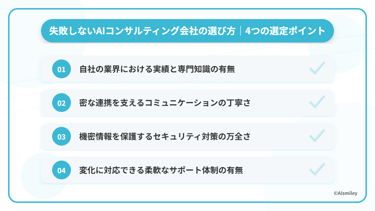 長期的な視点でAI活用のレベルを段階的に引き上げていく伴走支援こそが、優良なコンサルティング会社の真価が問われる部分と言えます。