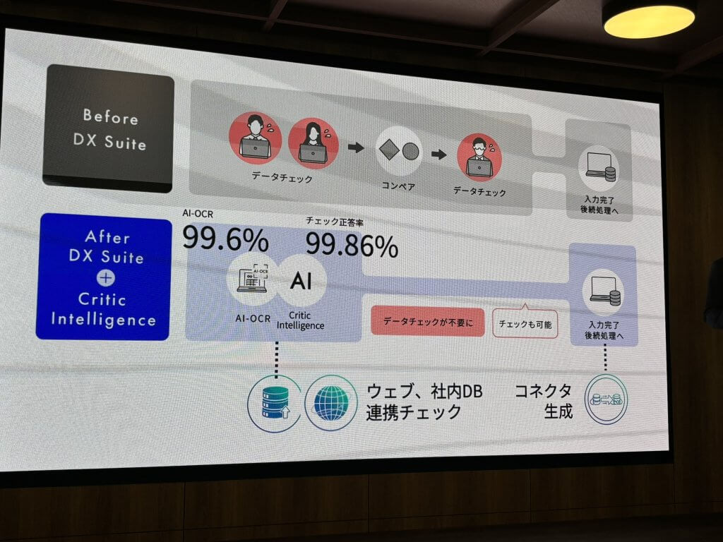 さらに今までの「DX Suite」では、人間のチェックを組み合わせる必要がありました。しかし今後は「Critic Intelligence」のAIが生成した内容をAI確認し、誤りのある箇所を提示する機能を組み合わせることで、人間によるデータの確認が不要になります。人間の確認精度は60%から80%程度ですが「Critic Intelligence」のチェック率は99.86%を達成しています。