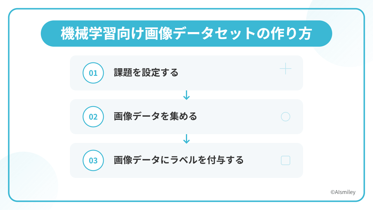 実際に機械学習向け画像データセットを作る場合、どのような方法で作成していけば良いのでしょうか。ここからは、機械学習向け画像データセットの作り方について、順序ごとに詳しくご紹介していきます。