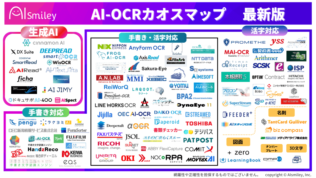 ※このカオスマップはAI-OCRを提供している企業のプレスリリースや製品サイト、導入実績などの公開情報を基にAIsmiley編集部が独自の主点で取りまとめたもので、網羅性や正確性を完全に担保するものではありません。