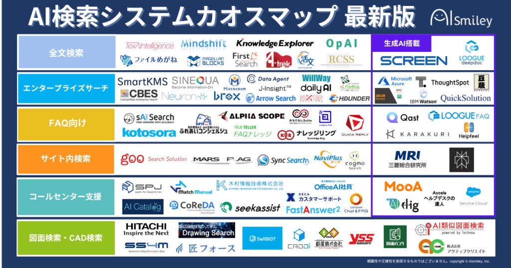 ※このカオスマップはAI検索システム提供企業のプレスリリースや製品オフィシャルサイト、導入実績などの公開情報を基にAIsmiley編集部が独自の主点で取りまとめたもので、網羅性や正確性を完全に担保するものではありません。