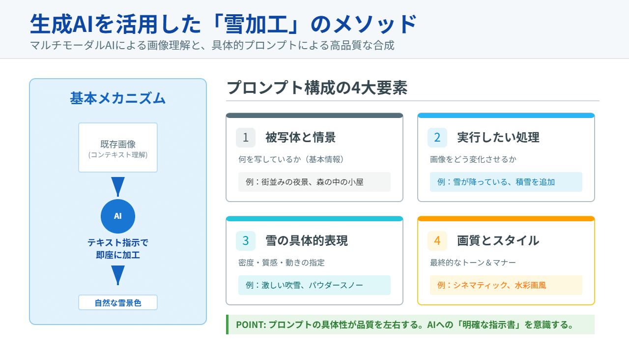 画像生成AIの生成品質は、プロンプトの具体性によって大きく左右されます。雪加工におけるプロンプト(呪文)は、AIに対する明確な指示書です。