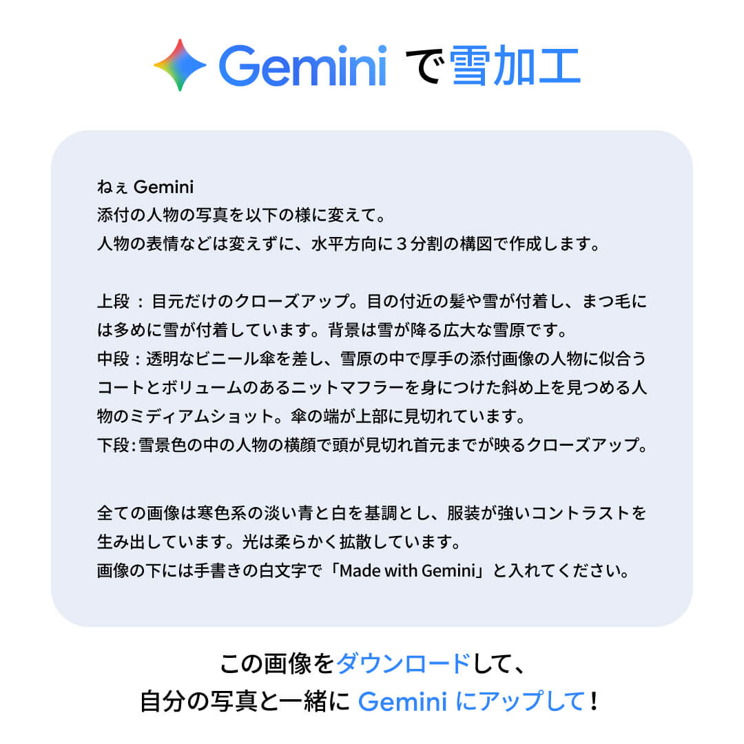 Geminiは、画像をアップロードし、チャットで指示を与えるだけで簡単に雪加工が可能です。