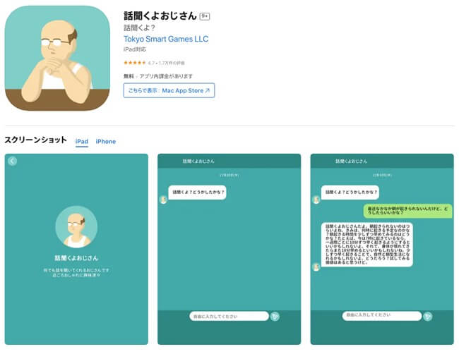AIのおじさんが、人に言いにくい悩みや愚痴など、どんな話でも優しく聞いてくれるAI相談アプリです。