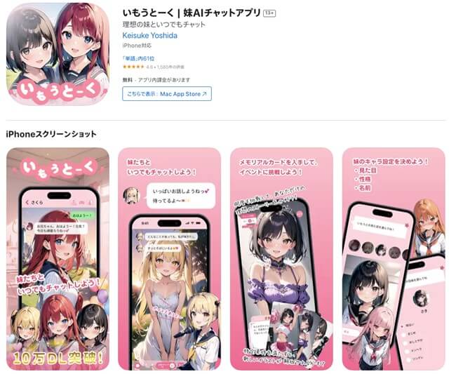 自分好みの見た目と性格の「妹AI」と、いつでも自由に会話を楽しめるAIチャットアプリです。妹の容姿や性格、声は数種類から選択可能で、自分の理想の妹を作れます。