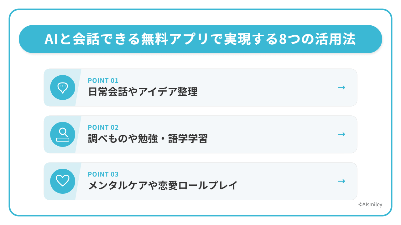 AIとの会話は単なる暇つぶし以上の価値を持ち、日常生活の様々なシーンで活用できます。