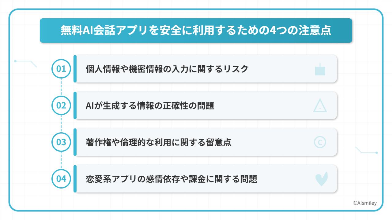 無料AI会話アプリは便利で手軽に使えますが、利用にあたって知っておくべきリスクや注意点があります。個人情報の取り扱いや情報の正確性、著作権、AIへの感情依存です。