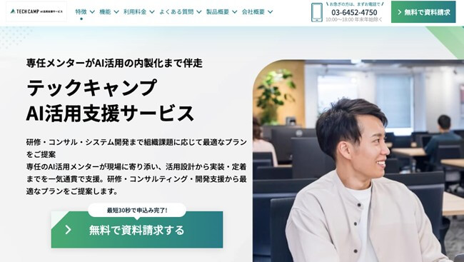 導入社数2,500社、受講者数20,000名の実績を持ち、生成AI基礎からChatGPT、Copilot、職種別活用まで幅広いコンテンツで確実な生成AI活用率向上を実現します。