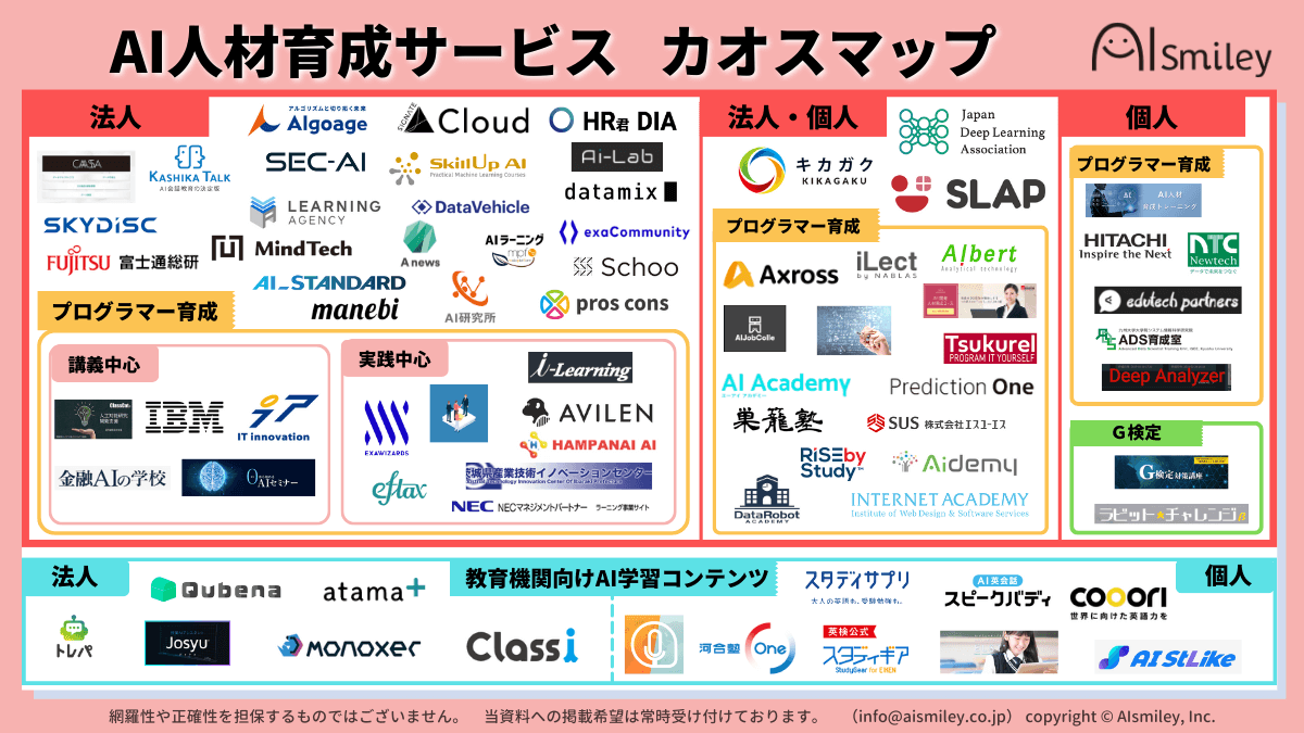 ※このカオスマップはAI人材育成サービスを提供している企業のプレスリリースや製品サイト、導入実績などの公開情報を基にAIsmiley編集部が独自の主点で取りまとめたもので、網羅性や正確性を完全に担保するものではありません。
