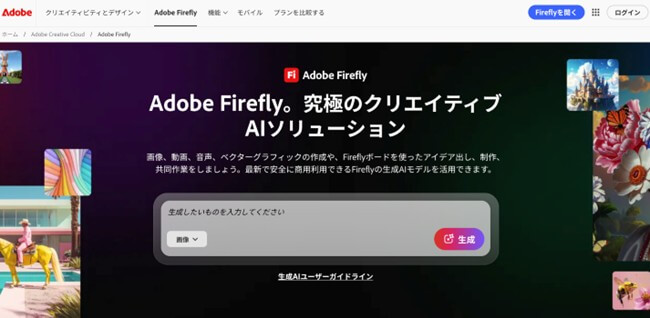 Adobe Fireflyは、PhotoshopやIllustratorといった業界標準ツールとシームレスに連携できる画像生成AIです。