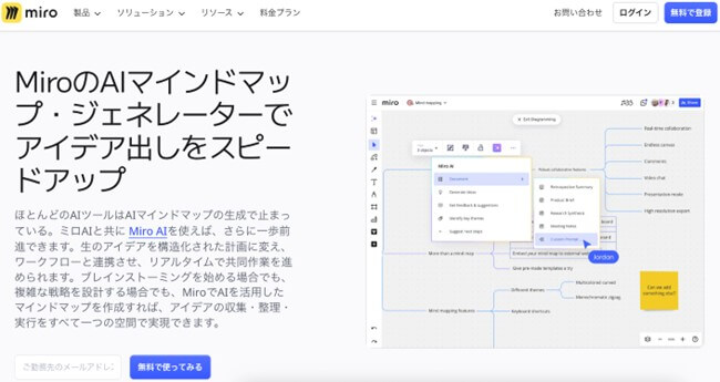 主な特徴 オンラインホワイトボード、チームでのアイデア出し、マインドマップ自動生成