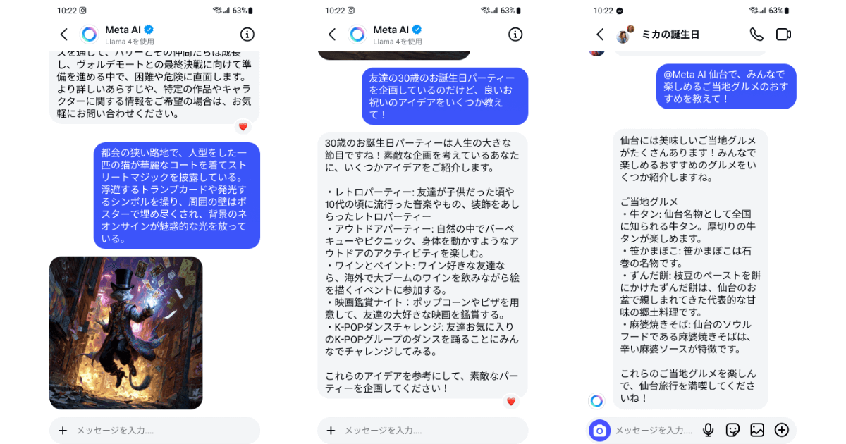 この段階的なローンチを経て、日本の利用者も、「Meta AI」を使ってアイデア出し、コンテンツ制作、テーマの深掘り、気軽な会話の共有などができるようになります。新しい市場に拡大する中で、現地の文化、歴史、慣用句、そして人々の日常生活で最も重要なことを「Meta AI」がより深く理解できるよう、継続的にフィードバックを取り入れていきます。