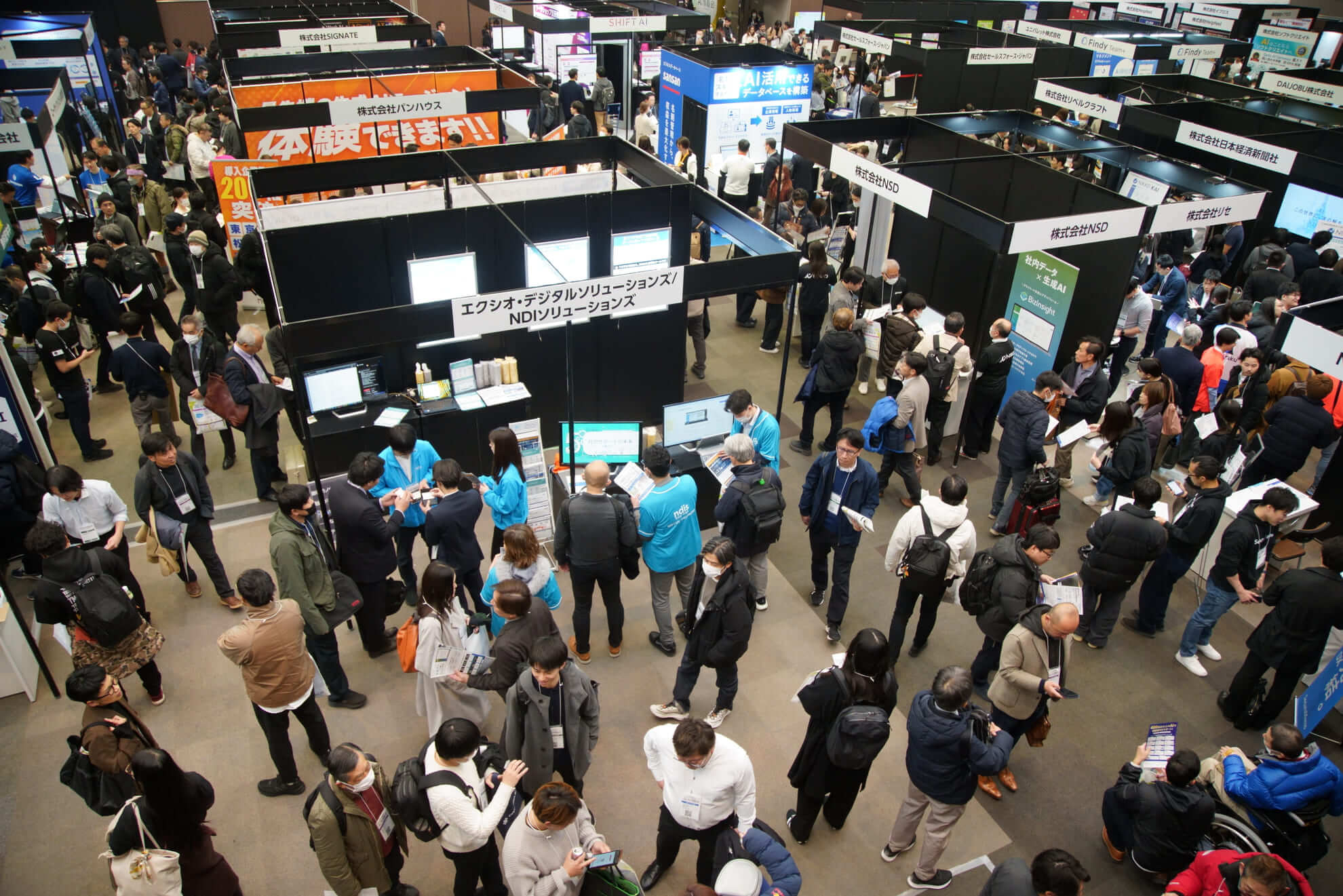 会場内には、約50社による100製品以上のAIソリューションが出展しています。各社のブースでは、実際のデモンストレーションを通じて最新技術を体験できるほか、具体的な導入に向けた活発な商談が会場の至る所で早くも始まっています。