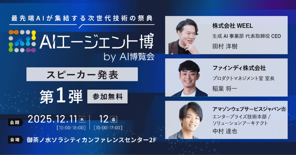 本日カンファレンス第1弾のスピーカー3名を公開しました。業界を牽引するトップランナーたちが語るAIエージェントの未来に、ぜひご参加ください。