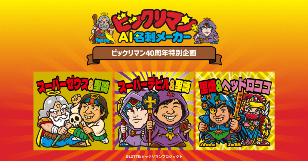 アル株式会社は、株式会社ロッテと共同で、ビックリマン40周年を記念した生成AIサービス「ビックリマンAI名刺メーカー」を、2025年12月16日から40日間限定で提供開始しました。