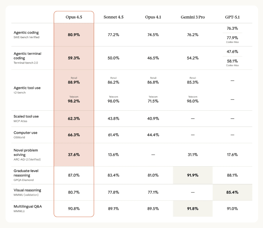 「Opus 4.5」は、視覚、推論、数学など多くの領域で能力を向上させ、前世代モデルを上回る性能を示しています。