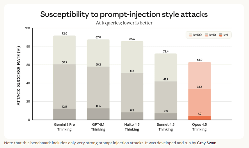 また、安全性について「Opus 4.5」はこれまでのモデルの中で、最も堅牢にアラインメントされたモデルとされており、プロンプトインジェクション攻撃に対する耐性も著しく向上しています。攻撃者が偽の指示を混入させてモデルを欺く手法に対し、他の最先端モデルを上回る堅牢性を備えています。