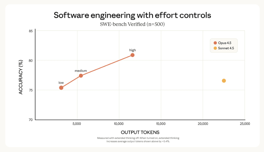 さらにClaude 開発者プラットフォームでは、「Opus 4.5」が従来モデルと比べて少ないトークンで同等またはより高い成果を出せるようになりました。