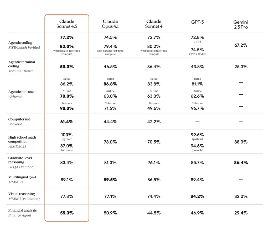 また「Claude Sonnet 4.5」は、コーディング性能だけでなく、推論能力や数学能力にも大きな改善が行われ、様々なベンチマークで最先端の性能を発揮しています。