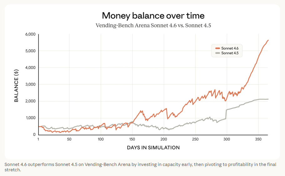 「Claude Sonnet 4.6」は、100万トークンのコンテキストウィンドウにより、大規模なコードベースや長文契約書、複数論文の同時処理が可能です。長期的計画能力の検証として実施されたVending-Bench Arena評価では、期間前半に投資を優先し、後半で収益重視へ転換する戦略を取ったことが紹介されています。