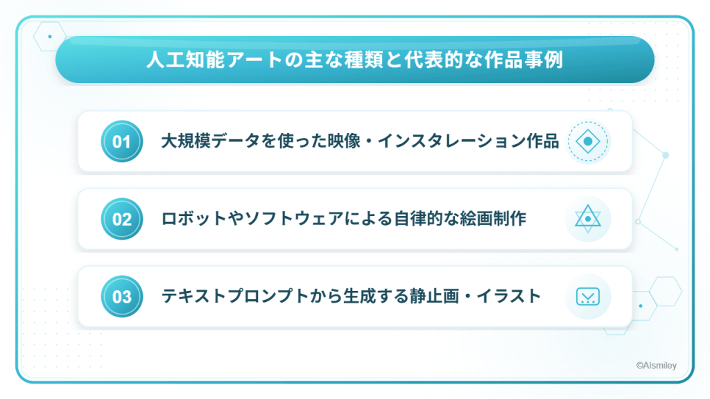 AIアートは「どのように作るか」によって大きく三つに分けられます。それぞれ使われる技術も、生み出される作品の印象も異なります。