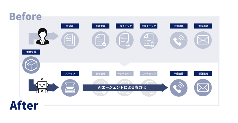 これまで人が行っていた到着データの判定、内容不備の検知、一次・二次チェック、不備連絡や督促連絡までの工程をすべてAIエージェントが自動で処理します。判定・照合・連絡といった従来人が行っていた負荷の大きい作業をAIエージェントが代替します。