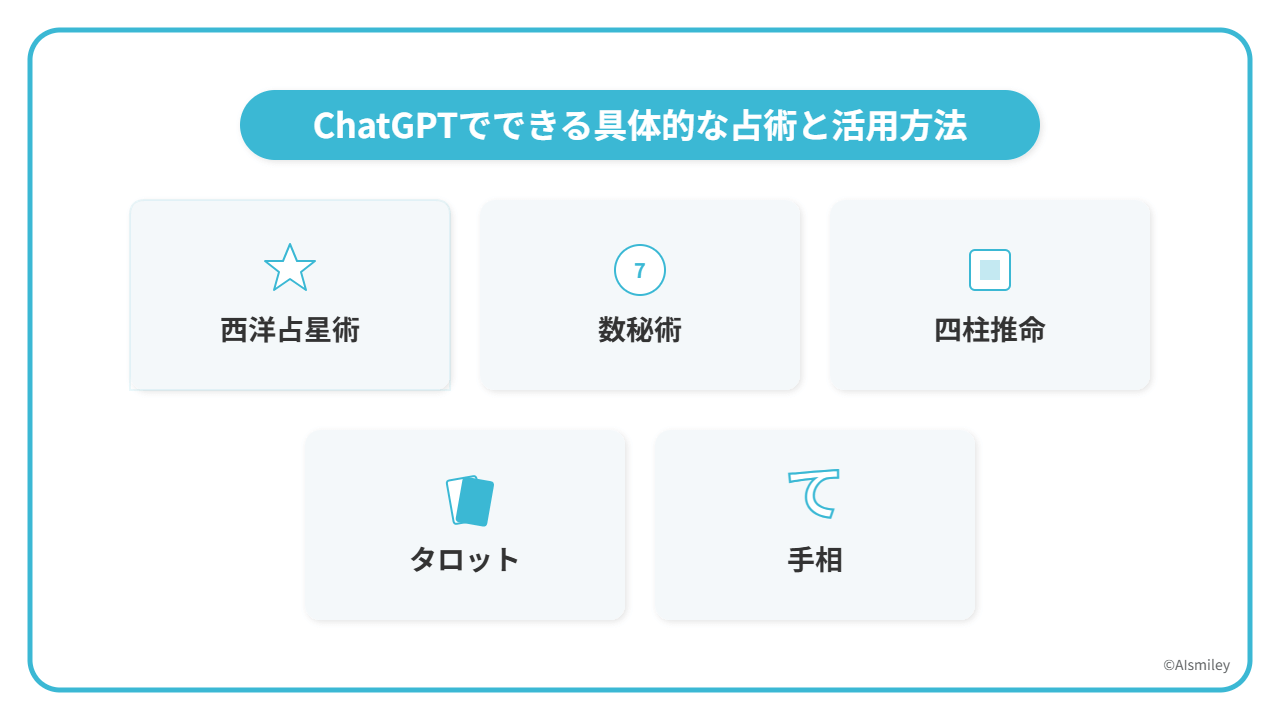 ChatGPTは、インターネット上の多様なテキストデータを学習しているため、手相や西洋占星術、数秘術、タロット、四柱推命といったさまざまな占術に関する知識を保有しています。これにより、ユーザーの生年月日や悩み、質問内容に応じて、占い師が行うような文章を生成できます。