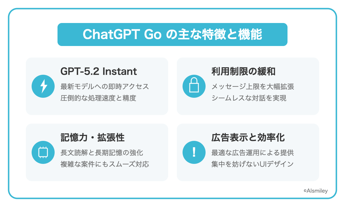ChatGPT Goは、OpenAIが提供する新しい有料プランで、無料版とPlusの中間に位置付けられています。主な特徴は以下の通りです。
