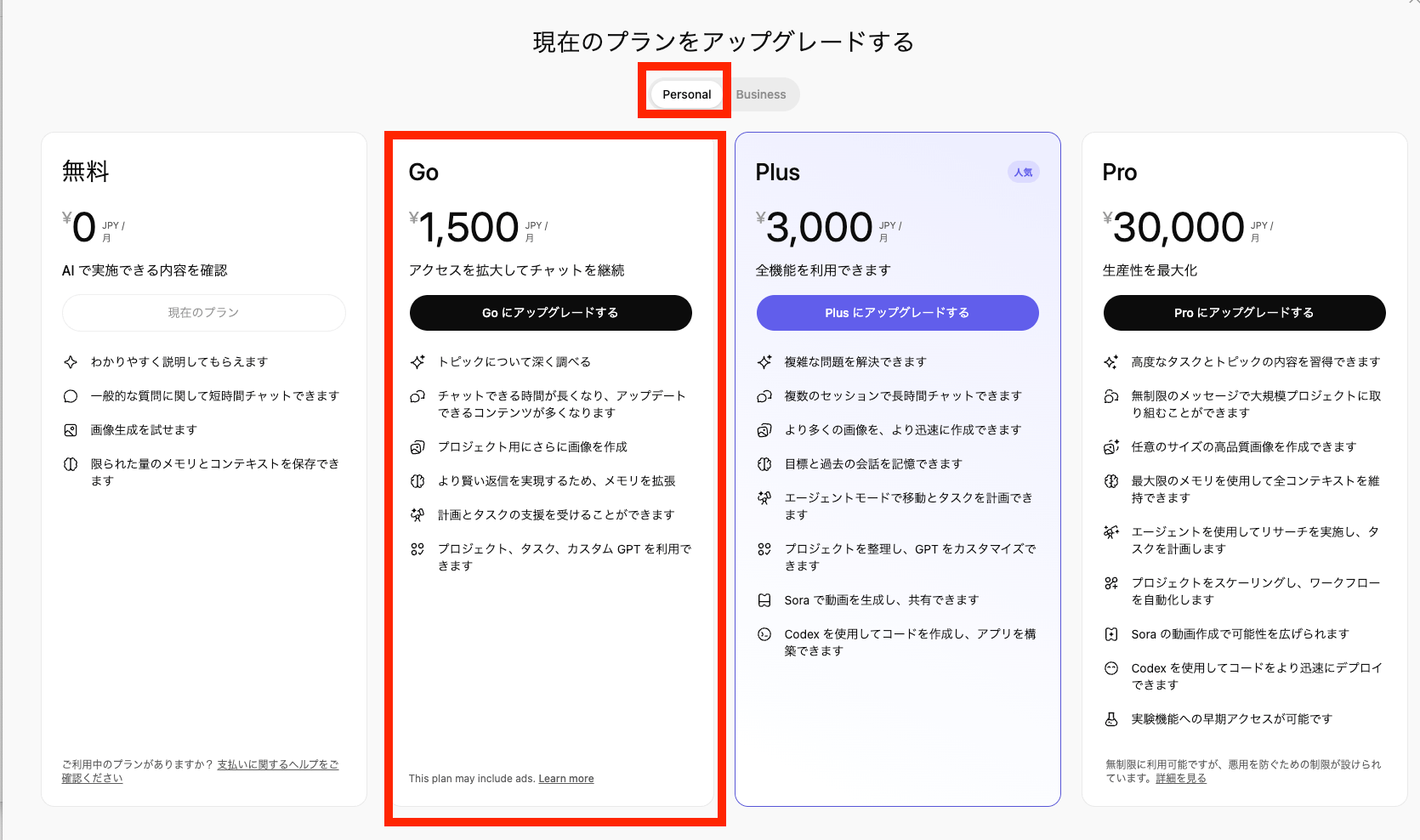 2. 「Personal」を選びプランの中から「ChatGPT Go」を選ぶ