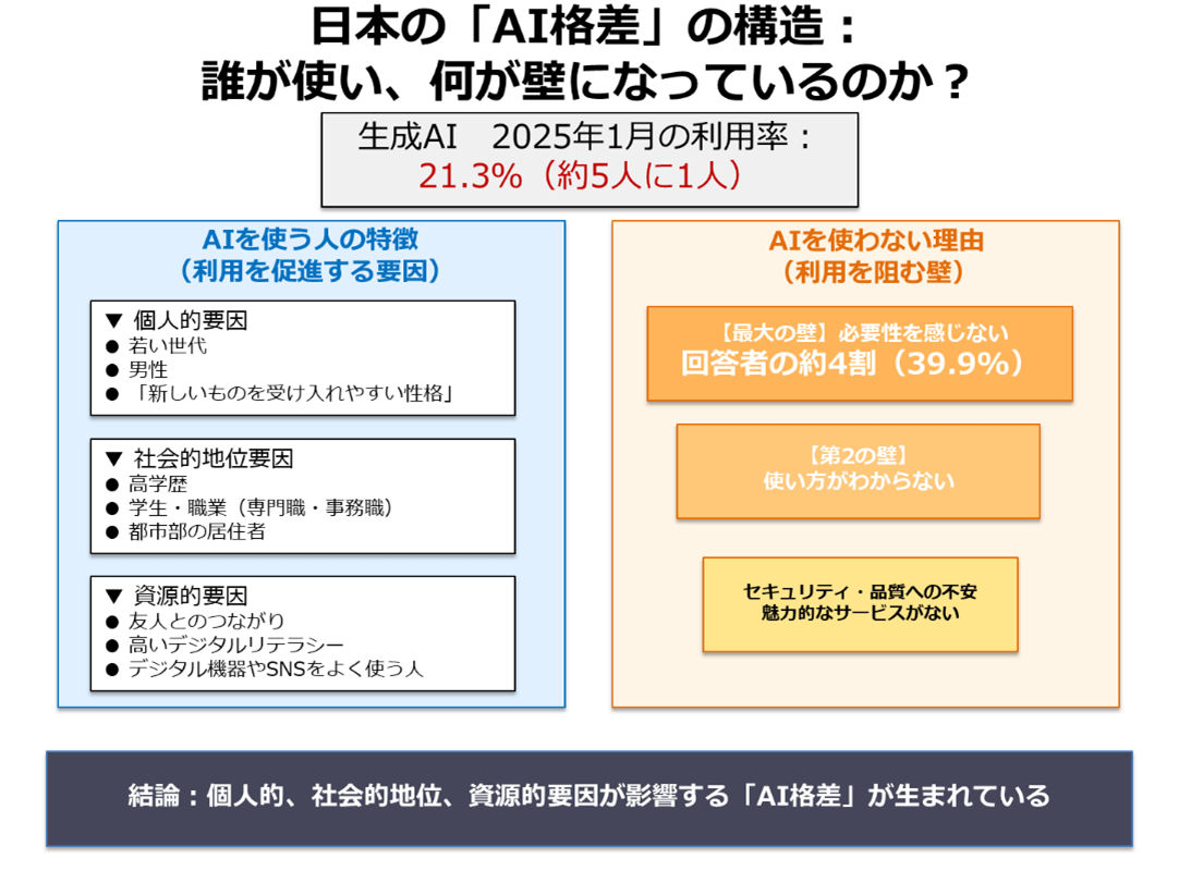 これらの結果から、生成AIの非利用は単なる「関心の欠如」ではなく、年齢や教育、デジタル環境に根ざした構造的な格差の表れであることが明らかになりました。