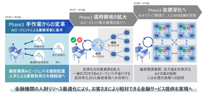 日立は、2026年4月から順次「融資DXサービス」にAIエージェントを実装し、各行の業務特性に合わせたチューニングを行い、他の金融機関へも提供します。最終的には、専門性を備えた多岐にわたるAIエージェントを、順次提供する予定です。
