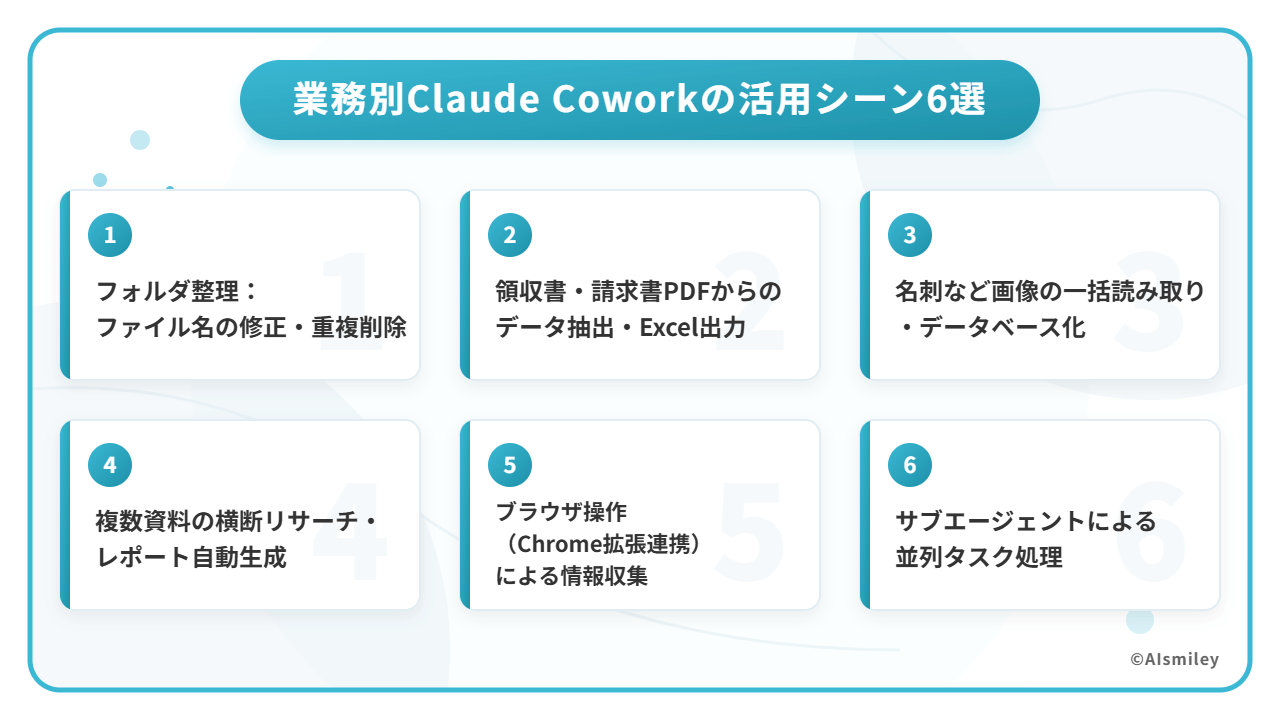 Claude Coworkは、日常の事務作業から専門的なリサーチまで幅広く対応しています。