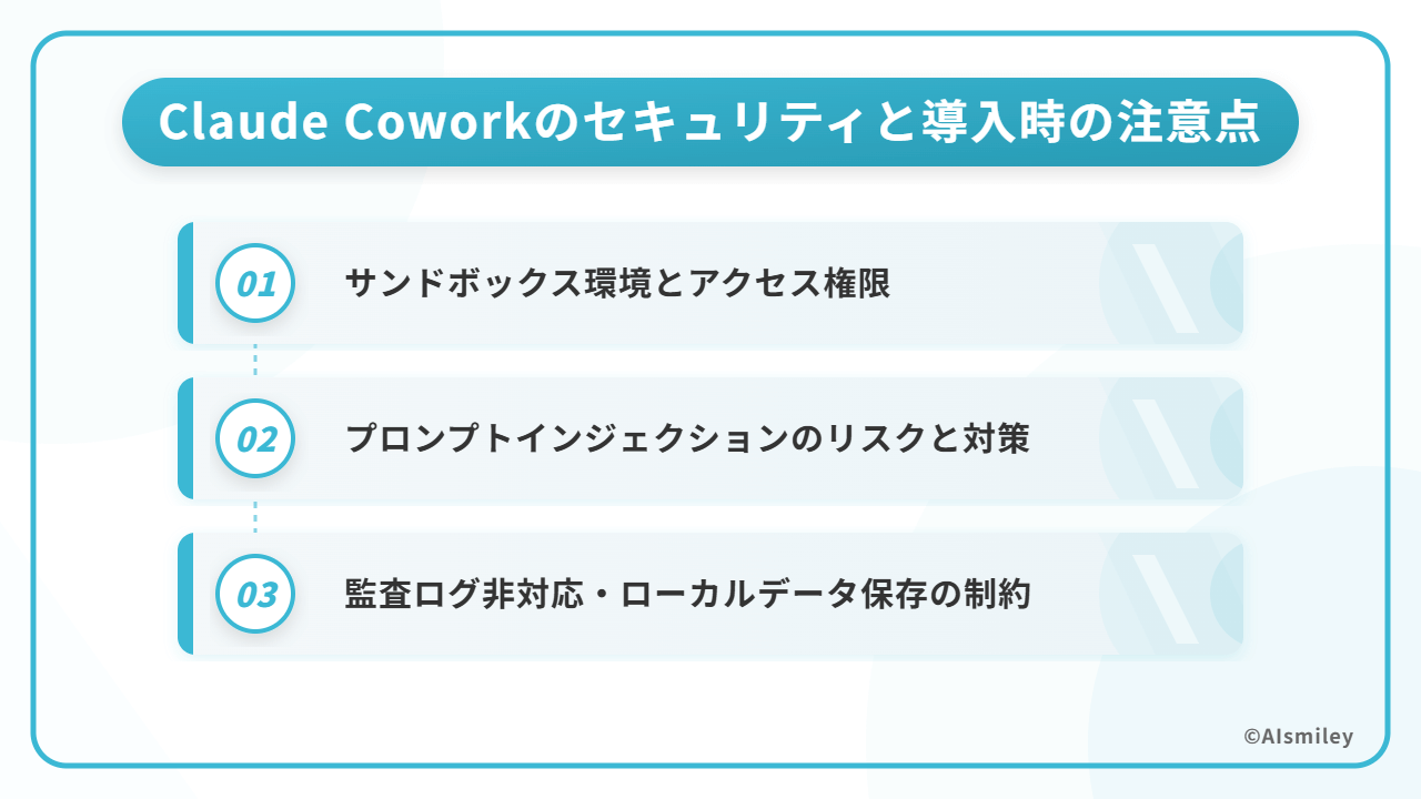 企業にとって、AIエージェントの安全な運用は最優先の課題です。Claude Coworkは仮想マシンによる隔離やフォルダ単位の権限制御など、一定のセキュリティ設計を備えている一方で、リサーチプレビュー段階であるがゆえの制約もあります。