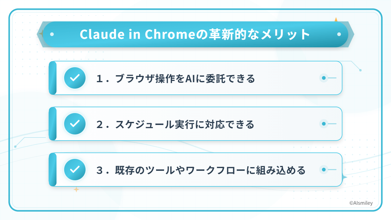Claude in Chromeが革新的といわれる理由を、3つのメリットに分けて解説します。