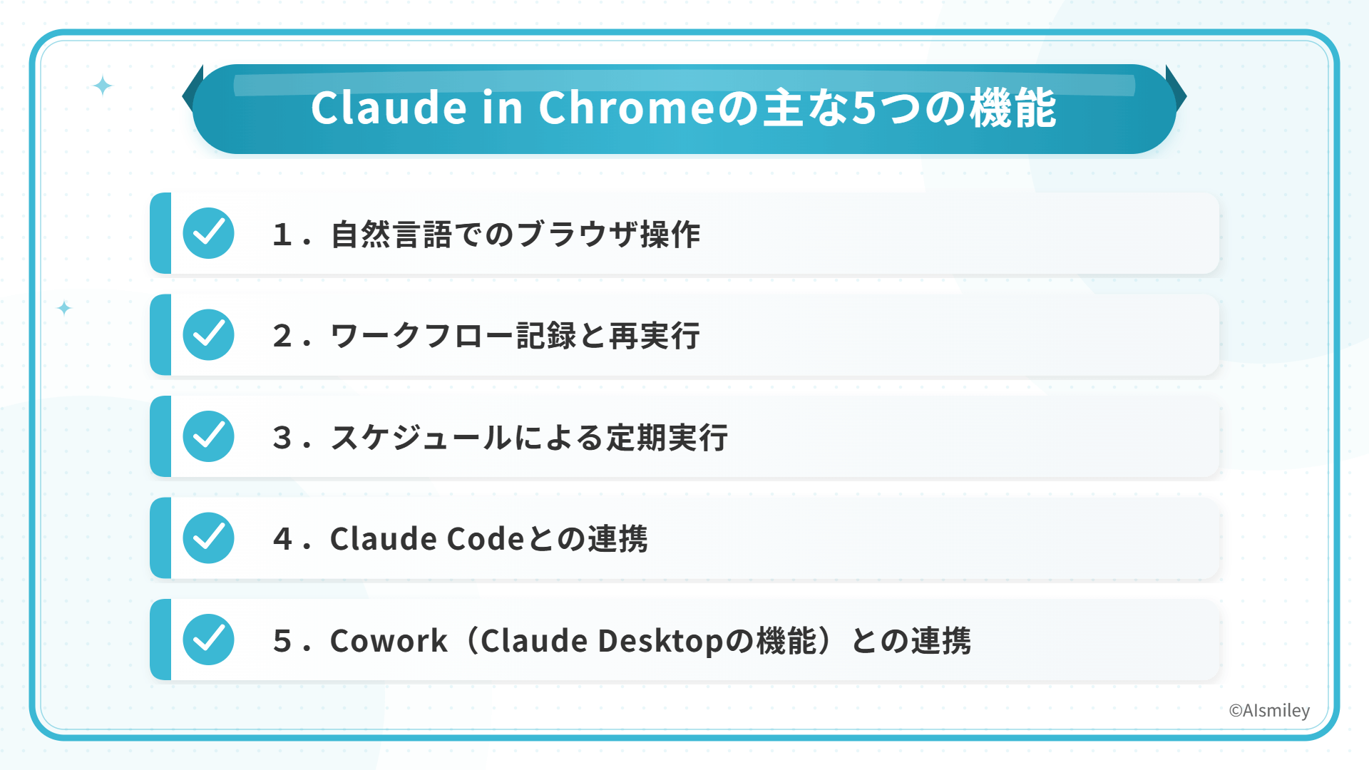 Claude in Chromeは、ブラウザ上のWeb操作をAIに委任できる拡張機能です。自然言語による操作指示、ワークフローの記録と再実行、スケジュール定期実行、Claude CodeやCoworkとの連携など、多彩な機能を備えています。従来のClaudeチャットが「聞いたことに答える」存在だったのに対し、Claude in Chromeは「行動まで代行する」存在へと進化しています。