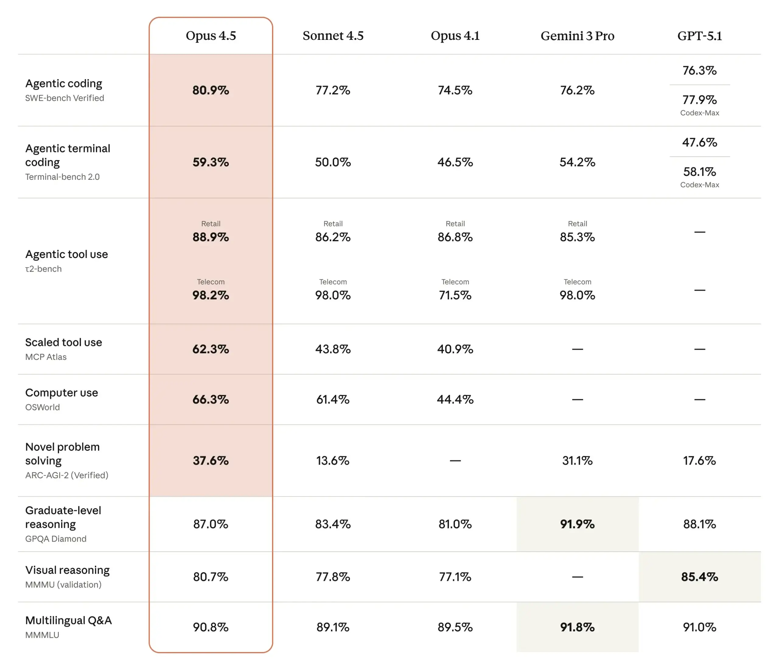 これらのベンチマーク結果は、Claude Opus 4.5が特に複雑で高度なタスクにおいて、業界をリードする性能を持つことを示しています。ただし、タスクの性質によっては他のモデルが優位な場合もあるため、用途に応じた選択が重要です。