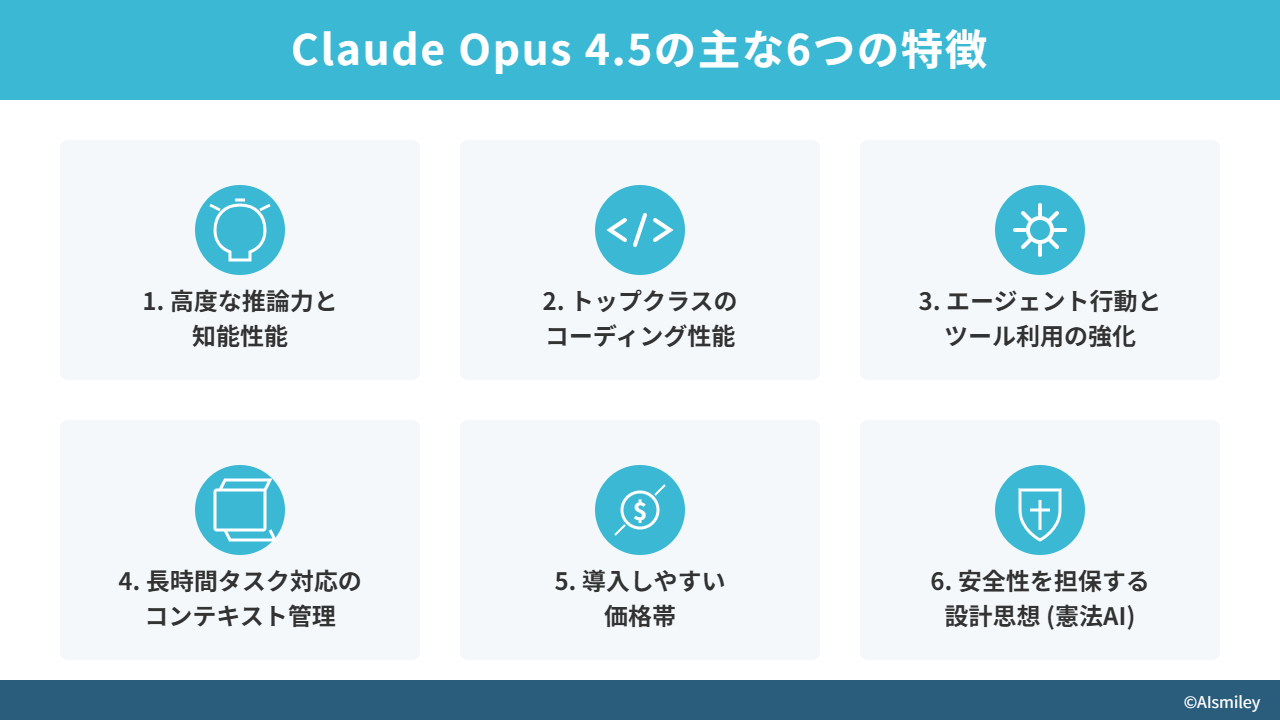 Claude Opus 4.5には、今までにない6つの特徴があります。その特徴について、解説しましょう。