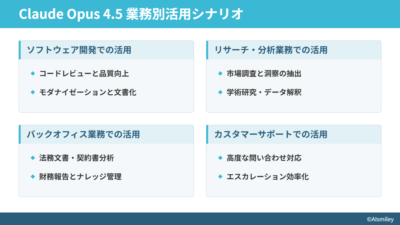 Claude Opus 4.5は、様々な業務領域で実践的に活用されています。ここでは、特に導入が進んでいる代表的なユースケースを紹介します。