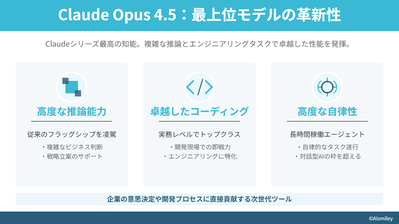 Claude Opus 4.5は、Claudeシリーズの最上位モデルとして位置付けられ、最も高い知能性能を実現しています。特に複雑な推論を要する業務や、エンジニアリングレベルのコーディングタスクにおいて卓越した性能を発揮します。