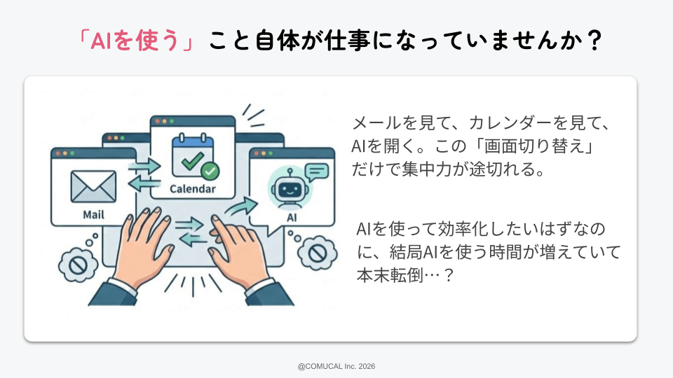 メールを見て、カレンダーを確認し、ChatGPTやGeminiの画面を開いてプロンプトを入力する。この「画面の切り替え」こそが、「思考を無駄に切り替える時間」となってしまい、私たちの集中力を奪っているんです。