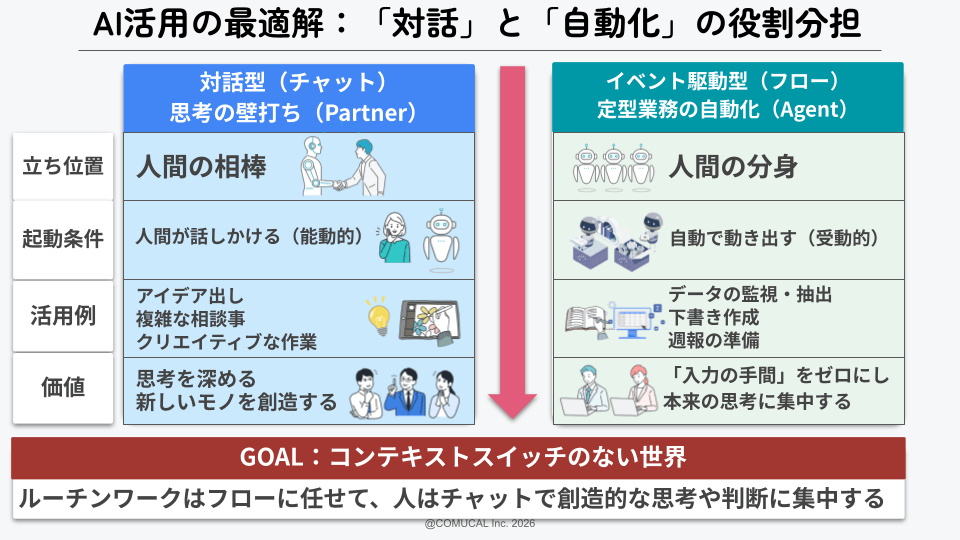 クリエイティブな相談や「壁打ち」には、これまで通りチャットAIを使ってください。