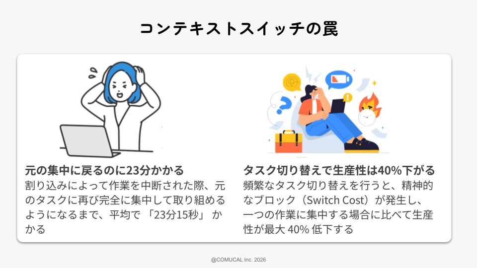 研究によると、頻繁なタスク切り替えは生産性を最大40%低下させると言われています。さらに一度集中が途切れると、元の深い集中状態に戻るまでに平均23分もかかるとされています。(カリフォルニア大学アーバイン校のGloria Mark教授の研究)