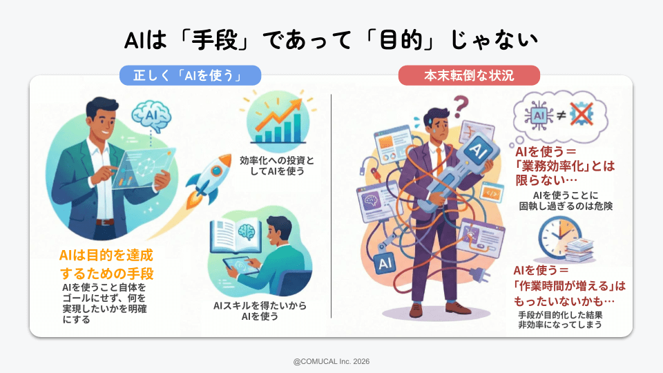 AIはあくまで手段。目指すべきは、「AIを使っていることすら意識させずに、業務が片付いている状態」です。